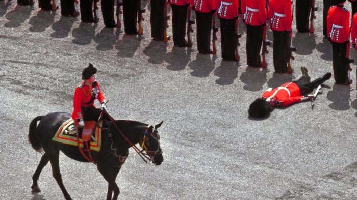 4. Tentara Kerajaan Inggris terkenal akan kedisiplinannya, tak peduli ada penjaga yang pingsan saat upacara, lainnya tetap melanjutkannya.