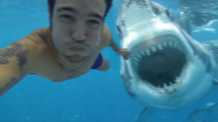 Sebab dalam foto ini, ia ingin menunjukkan pada dunia, ia akan dimakan oleh ikan hiu.