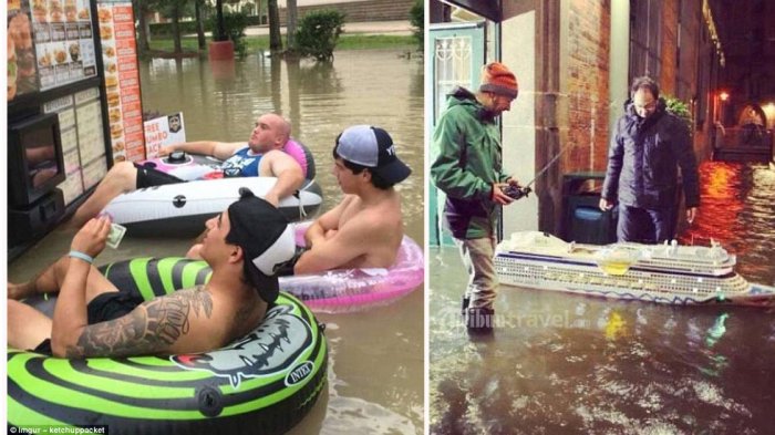 Ada yang bersenang-senang di tengah banjir, dan ada juga yang memanfaatkan kesialan dengan hal tak terduga.