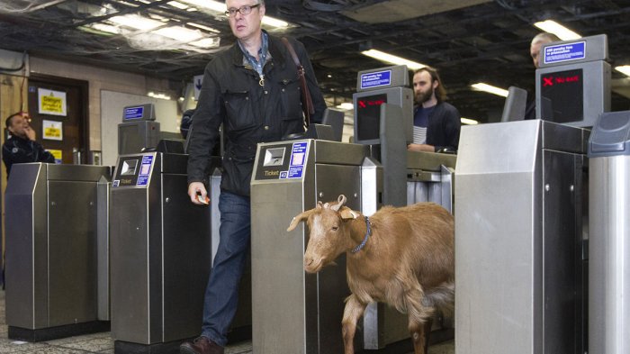 5. Seekor kambing bernama Barney dari Peternakan Vauxhall, berjalan melalui penghalang tiket komuter pada pagi hari di sebuah stasiun bawah tanah di London.