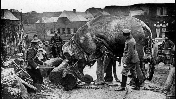 1. Foto yang diambil pada 1915 ini menunjukan seekor gajah yang tengah membantu membawa bongkahan kayu di Hamburg.