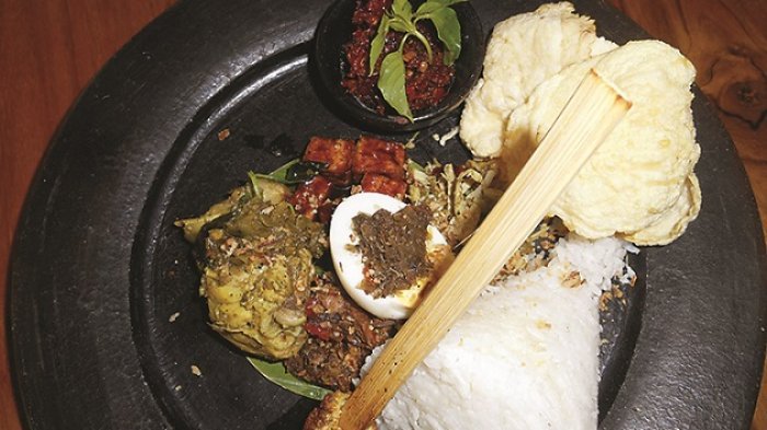 Nasi campur ini memadukan nasi putih yang dibentuk tumpeng, dengan lauk ayam, sapi, telur, tahu, sate lilit, sambal ulek, dan emping.