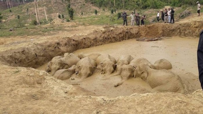 Suatu kali ada 11 kawanan gajah yang masuk kolam lumpur raksasa yang berada di Kamboja.