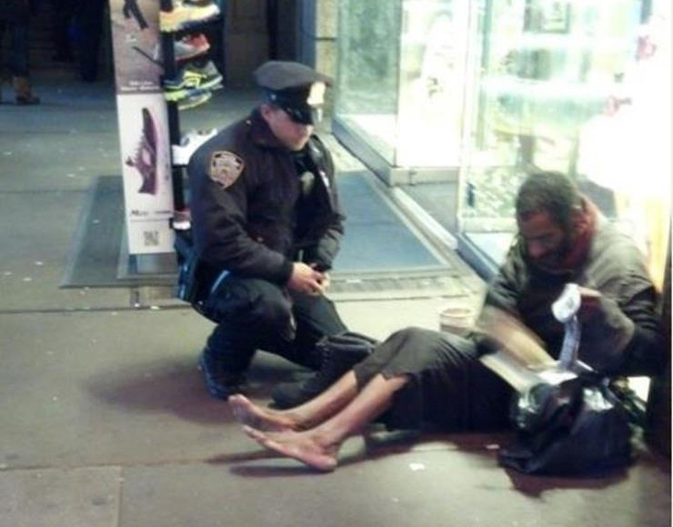 4. Seorang polisi di New York memberikan sepasang sepatu kepada tunawisma yang sedang duduk tanpa alas kaki.