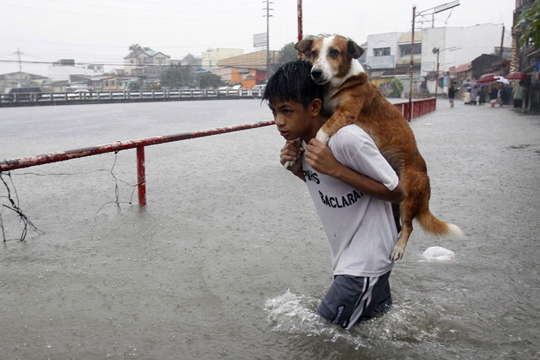 5. Seorang anak menggendong anjing peliharaannya ketika badai muson di Manila, Filipina.