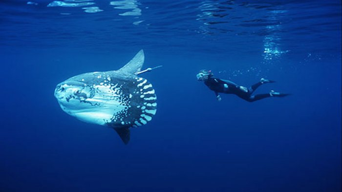 Namun penyelamannya tiba-tiba dikejutkan dengan sunfish atau ikan mola-mola si raksasa laut.