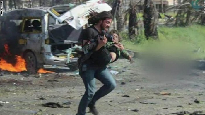 Melihat kejadian itu Habak langsung mengambil kamera miliknya dan berlari kearah anak laki-laki yang terluka parah oleh ledakan.