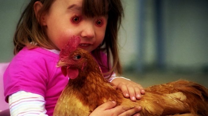 Mata ayam pada wajah bayi ini terlihat mengerikan.
