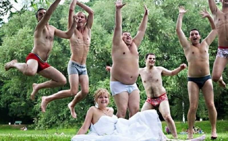 Dimana beberapa orang pria yang hanya mengenakan celana dalam melompat di belakang mempelai perempuan.