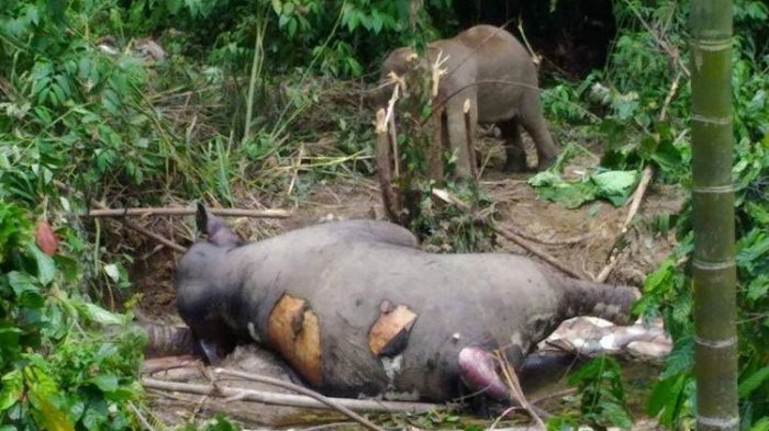 Ternyata gajah tersebut sudah mati, sedangkan bayi gajah berada di sampingnya.