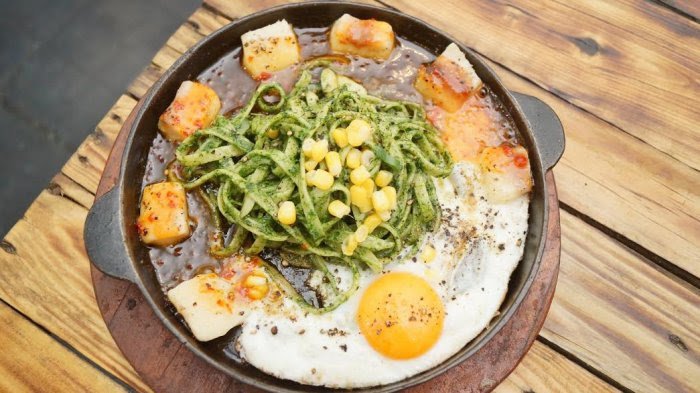 Terdapat gundukan fettucine, nama pasta khas Italia yang berbentuk mie pipih dan panjang, berwarna hijau berhiaskan jagung serut, potongan daging warna putih, saus merah nampak terdapat ulekan kasar cabai merah, dan telur ceplok yang terlihat masih mentah di sisi yang lain.
