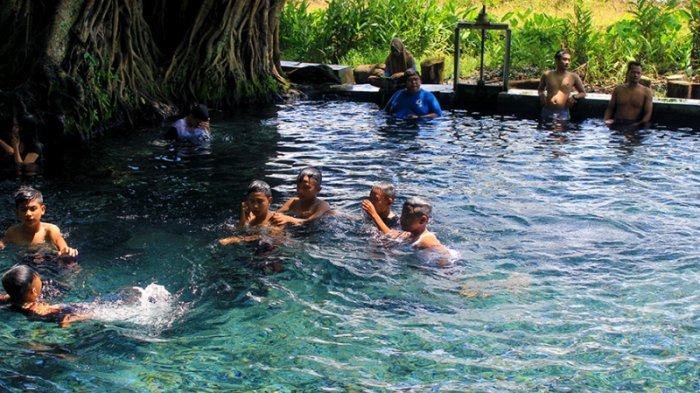 Selain itu, kesegaran air yang sangat jernih itu, membuat pengunjung betah berlama-lama berada di dalam kolam alami tersebut.