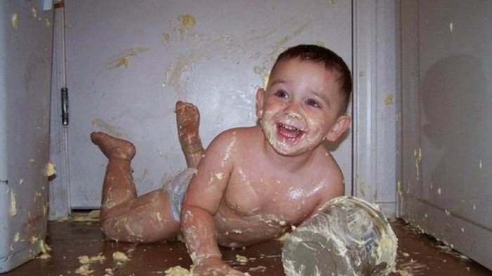 Balita ini tampak senang bisa menghabiskan semua mentega dari wadahnya.