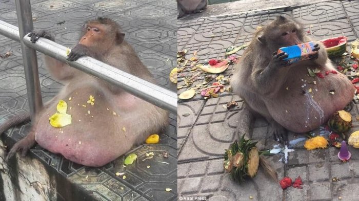 Kali ini, ada seekor monyet obesitas di Thailand yang terlihat memiliki berat dua kali ukuran normal untuk spesiesnya.
