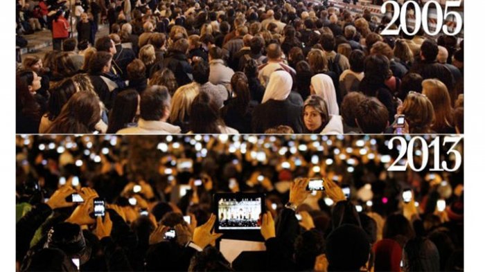 Delapan tahun kemudian, ribuan Katolik Roma menyaksikan Paus Francis dengan asumsi tahta kepausan, sementara memegang smartphone mereka dipercaya untuk mendokumentasikan peristiwa sejarah.