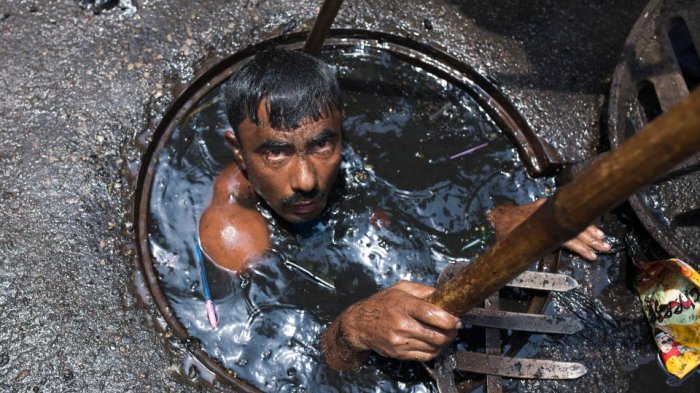 Menyedihkannya, pekerja ini langsung masuk ke dalam selokan yang sangat kotor itu.