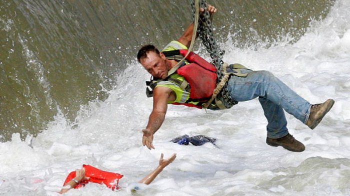 Dalam foto ini, seorang pria melakukan upaya penyelamatan terhadap korban yang terbawa arus air deras. (TribunStyle.com/Cecylia Rura Patulak)