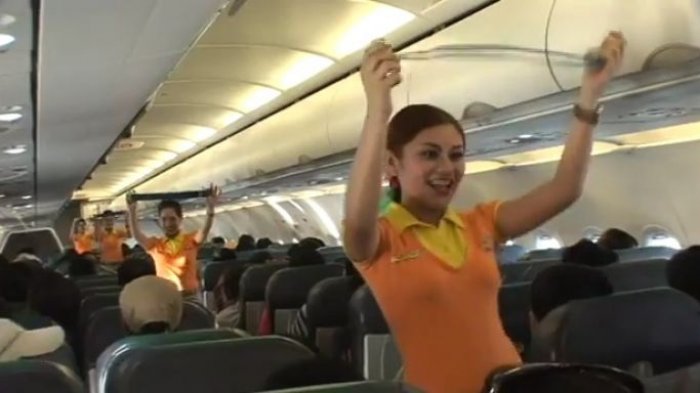 Tarian Gemu Famire dimodifikasi menjadi gerakan pramugari memperlihatkan tata cara keselamatan penumpang pesawat.