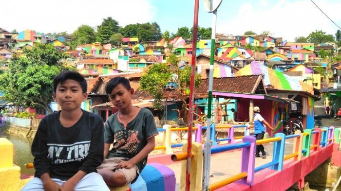 TRIBUNTRAVEL.COM - Cat berwarna warni nampak menghiasi rumah rumah yang tersusun di perbukitan, di jalan masuk pemukiman yang berupa jembatan berwarna merah beberapa anak sedang bermain tanpa alas kaki.