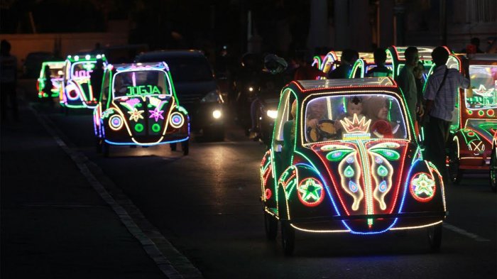 Selain itu becak hias juga dihias dengan lampu led warna-warni yang membuat suasana Alkid semakin semarak.