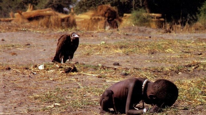Pada foto itu, terlihat seorang bocah yang mengalami busung lapar sedang mengerang kesakitan, sementara burung bangkai sudah menantinya.