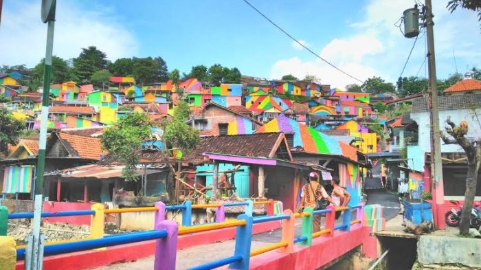 TRIBUNTRAVEL.COM, SEMARANG - Cat berwarna warni nampak menghiasi rumah-rumah yang tersusun di perbukitan, di jalan masuk pemukiman yang berupa jembatan berwarna merah beberpa anak sedang bermain tanpa alas kaki.