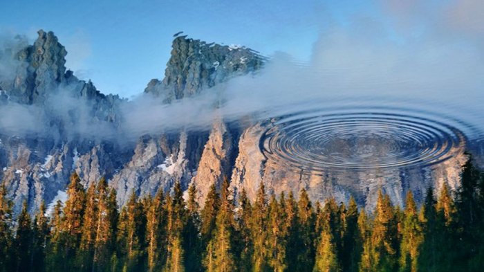 4. Gelombang yang disebabkan kerikil yang dilempar di permukaan air Danau Carezza, Italia