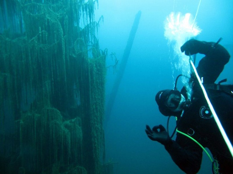 Uniknya, meski suhu air sangatlah dingin, pohon pinus yang ada di dalam danau masih bisa tumbuh, bahkan sampai 100 tahun