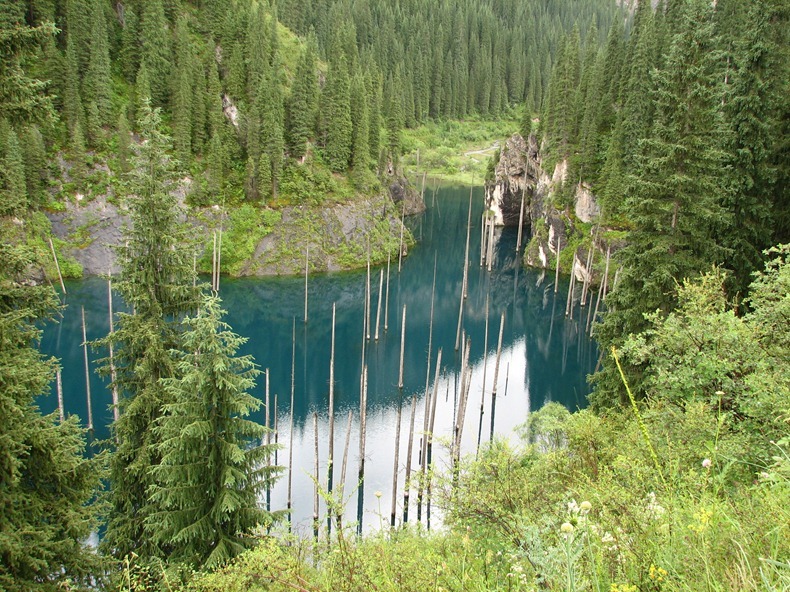 Dan karena airnya yang jernih, kamu yang datang ke Danau Kaindy bisa melihat kedalamannya dengan jelas.