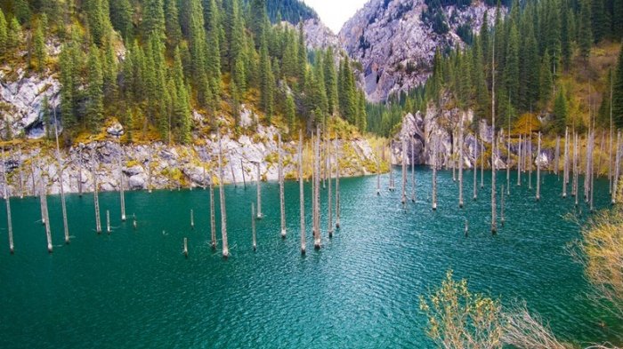 Dilansir TribunTravel.com dari laman amusingplanet.com, Kaindy Lake merupakan danau yang memiliki panjang 400 meter dan berada di Pegunungan Tianm Kota Almaty.