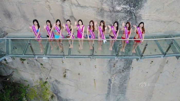 TRIBUNTRAVEL.COM - Sekelompok model berbikini asal Tiongkok membuktikan keberanian mereka dengan berpose di atas jembatan kaca penantang maut.