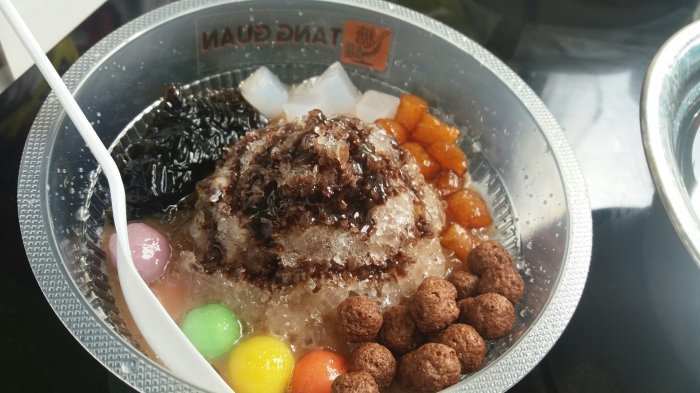 Mi yang sudah terendam sup kemudian ditaburi serutan es batu.