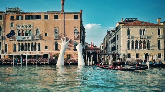 Dilansir TribunTravel.com dari laman boredpanda.com, seniman asal Italia, Lorenzo Quinn menciptakan patung monumental ini untuk perayaan 2017 Venice Art Biennale.