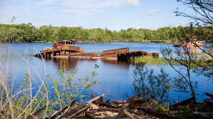 Bangkai kapal ini dibiarkan karam di Sungai Pripyat.