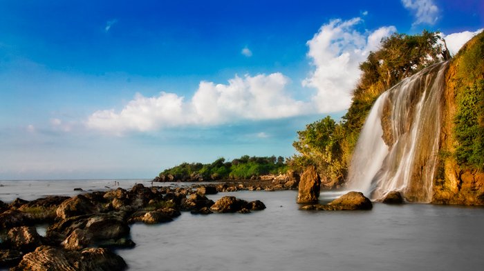 Salah satunya adalah pantai dengan air terjun yang jatuh tepat di bibir pantai.