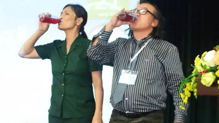 Bahkan ada seorang wanita yang langsung menenggak cairan berwarna merah itu demi membuktikan jika herbisida tak beracun.