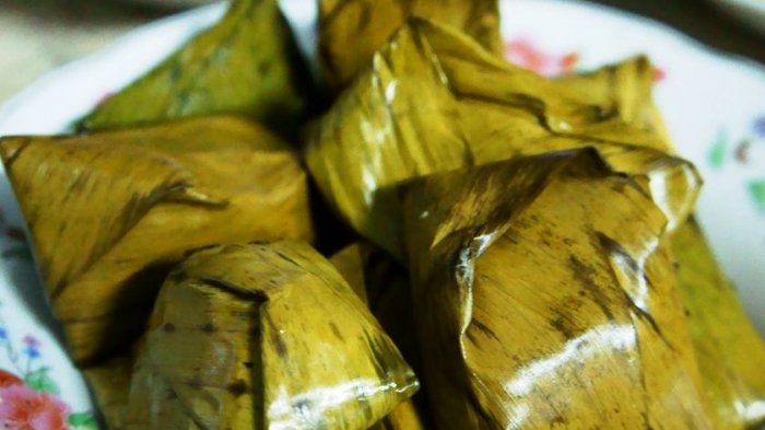 Lapek bugih atau lepat bugis terbuat dari tepung beras ketan dan santan kelapa yang dibungkus menggunakan daun pisang.