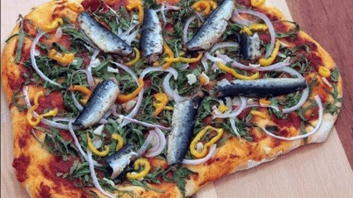 Pizza ini diberi topping mackrel, tuna, sarden, salmon dan bawang.