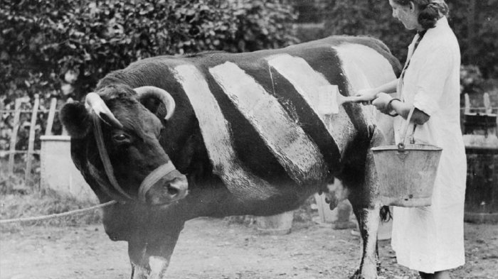 Dalam upaya menjaga ternak mereka, para petani melukis tubuh peliharaan mereka dengan cat putih garis-garis untuk menghindari kecelakaan.
