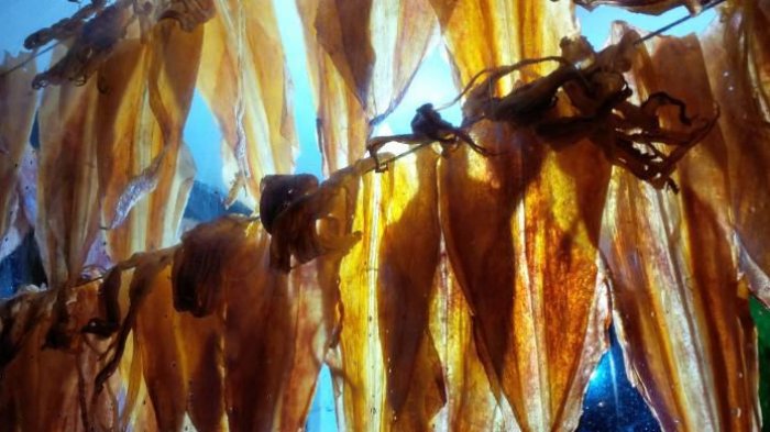 Sotong dipukul-pukul dengan menggunakan palu agar rasanya gurih.