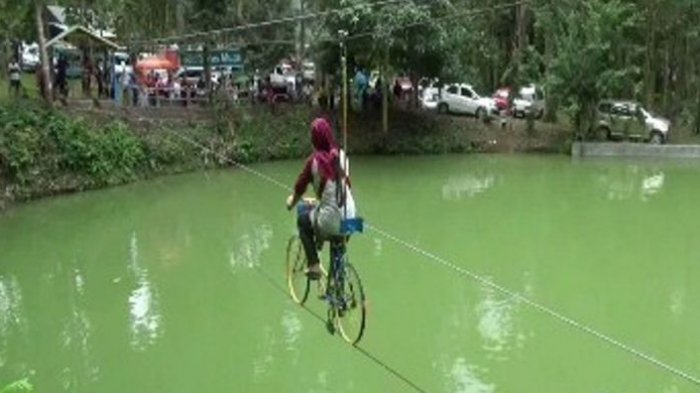 Uji nyali dengan cara bersepeda di atas bentangan tali sambil melintasi telaga yang dikelilingi pepohonan hijau nan asri.