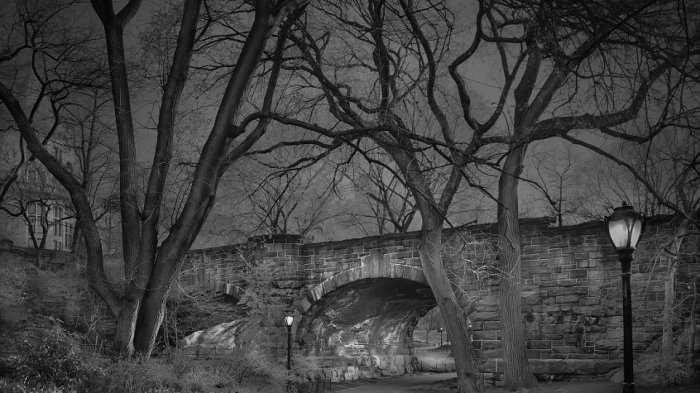 Suasana taman saat tengah malam itu terlihat kosong, dalam foto itu juga terlihat Dakota Apartments dan Plaza Hotel.