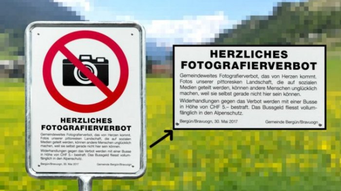 Untuk mencegah pengunjung mengambil foto di Bergün, warga mengenakan denda 5 Euro bagi tertangkap melanggar aturan ini.