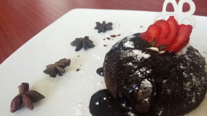 Chocolate Lava Cake merupakan cake cokelat dengan sensasi cokelat yang meleleh ketika dipotong.