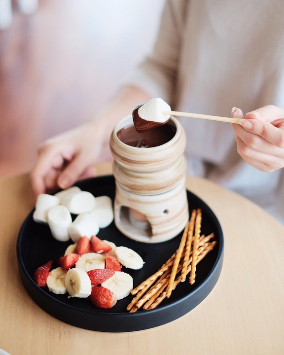 Kafe ini menyajikan Chocolate fondue dengan marshmellow, buah-buahan, dan biskuit stik-nya yang siap menggoyang lidah kamu loh.