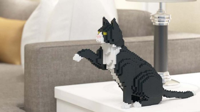 Patung kucing ini berkonsep seperti Lego, sehingga bisa dibentuk dalam berbagai pose, seperti menggeliat, duduk, berjalan, maupun, berbaring.