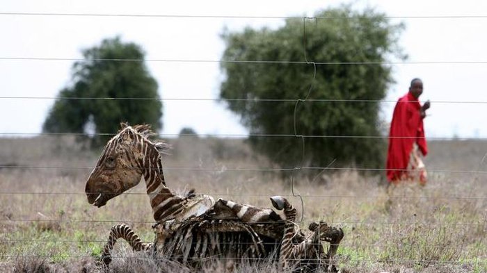 Seorang pria dari suku Maasai ini sedang melewati bangkai zebra yang tewas karena kekeringan.