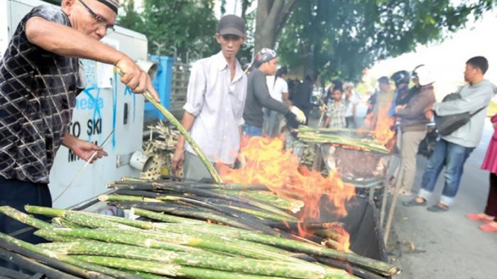 Pucuk rotan berukuran sekitar satu meter ini terlebih dahulu dipanggang di atas bara api batok kelapa atau arang yang dibakar.