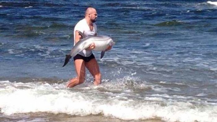 2. Seorang turis mengembalikan bayi lumba-lumba yang terdampar di pantai, sayangnya tidak disebutkan di mana lokasinya.