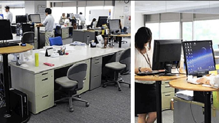Manajer sekalipun, yang menjanya berada di ujung deretan kelompok meja karyawan, juga harus menggunakan meja berdiri saat memakai PC.